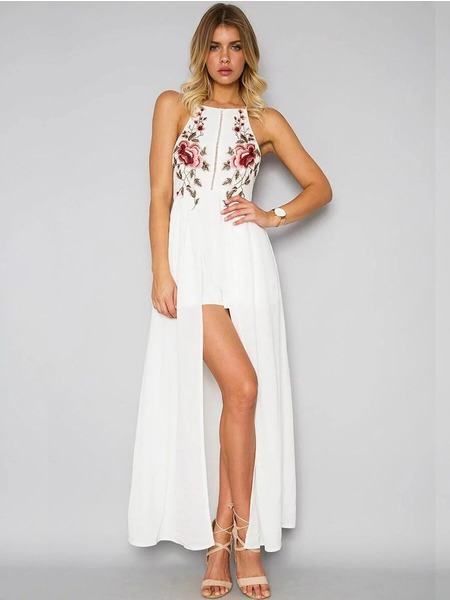 Изысканное пляжное платье с принтом из роз на лифе – эффектный способ привлечь к себе внимание мужчин в прибрежных кафе и на прогулке вдоль берега. Легкая белая юбка с разрезом, демонстрирует всю длину ног обладательницы, а облегающий покрой верхней части с воротником-чокером, визуально подтягивает силуэт, позволяет казаться выше и стройнее. С помощью этого платья несложно скрыть не совсем выразительную талию – сужающийся рисунок лифа с легкостью сформирует ее.